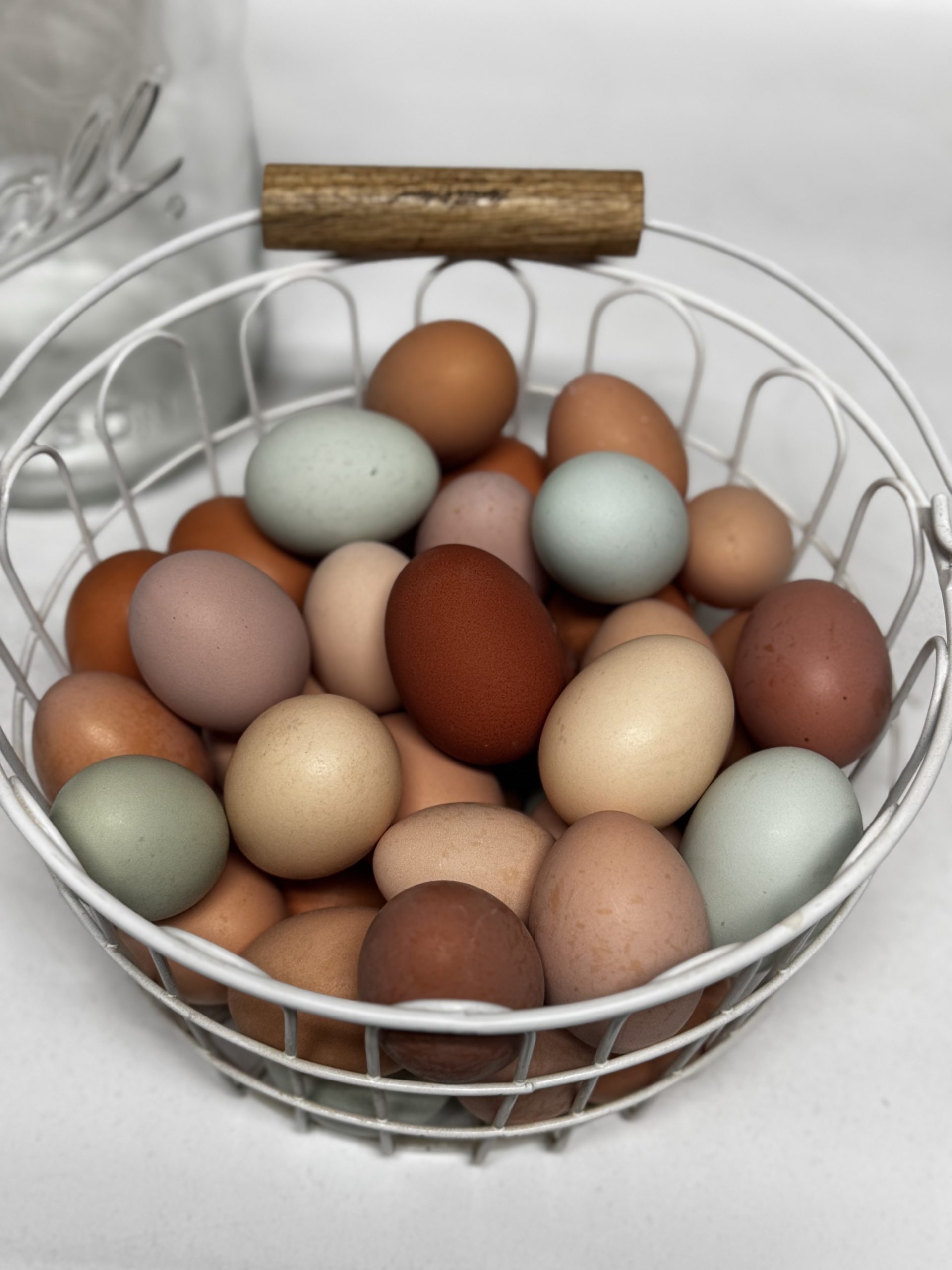 Enjoy one dozen farm-fresh , free-range chicken eggs from our happy hens at Petal and Plow Farm. Each egg is laid by chickens that roam freely in our farm pastures, foraging for insects, worms, and nutrient-rich grasses. Our hens are fed a supplemental diet of Organic and non-GMO grains, ensuring their eggs are packed with flavor and nutrition. We offer them hebs and flowers grown on our farm to enrich their diets and health. These eggs feature vibrant orange yolks, firm whites, and a freshness you can taste in every bite. Whether you’re scrambling, frying, or baking, our farm-fresh eggs are perfect for all your culinary needs.